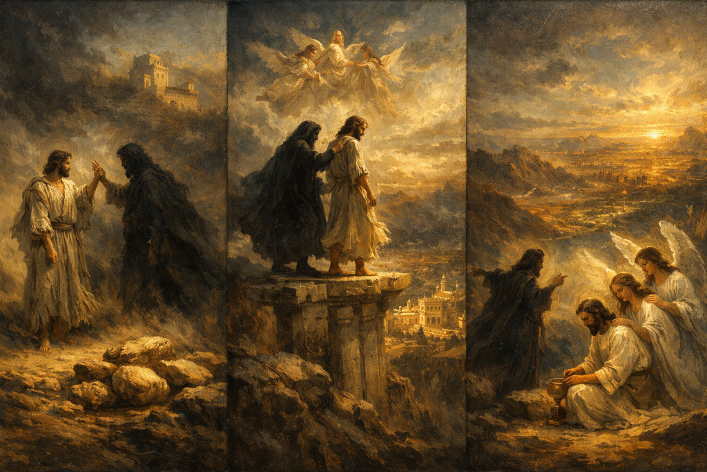 W tych najtrudniejszych chwilach szatan próbował wśliznąć się przed Jezusa ze swoimi możliwościami, ale On był tak nieugięty jak na pustyni. Jezus nie uciekał nigdy przed samotnością. Przyjął opuszczenie przez najbliższe osoby. Noce spędzał na rozmowach z Ojcem. Popatrzmy na nasze noce. Co staje się naszym ołtarzem, gdy zamykamy drzwi, przekręcamy klucz i zostajemy sami w swoim mieszkaniu? Nawet w ostatnich chwilach Jezus w Ogrodzie Oliwnym modlił się na odległość rzutu kamieniem, w pewnym dystansie od apostołów, w samotności, z Ojcem. Na odległość rzutu kamieniem, a nie chlebem! Diabeł kusił posiadaniem i władaniem wszystkich królestw i wszystkich ludzi za cenę jednego prostratio: upadnij! W Ogrodzie Oliwnym zdarzyła się sytuacja, która jest jakimś refleksem kuszenia na pustyni. Ludzie, którzy przyszli aresztować Jezusa, gdy usłyszeli słowa: „Ja jestem”, upadli na twarz. Jezus nie wykorzystał sposobności, by zapanować nad nimi w taki sposób, jaki mu proponował diabeł. Miał tylko tych, których dał Mu Ojciec. Nie szukał stadionów, by Go oklaskiwano. To jest światło rzucone na naszą uczuciową zaborczość, materialną pazerność, skupianie uwagi na sobie, próżność. Jezus był wyniesiony, ale nie na narożnik świątyni, tylko na krzyż. Stał się widowiskiem hańby! Diabeł kusił Go, aby rzucił się z narożnika i nawet cytował Psalm 91 o aniołach troszczących się o każdy krok Mesjasza, ale Jezus zrezygnował z demonstracji chwały. Ponieważ nie ta chwała na ziemi się liczy, ale ta w niebie. Pomiędzy chwałą nieba i chwałą na ziemi, czyli tą demoniczną, jest pomost krzyża – pomost rezygnacji, zmarnowania okazji na wyniesienie w tym świecie!
