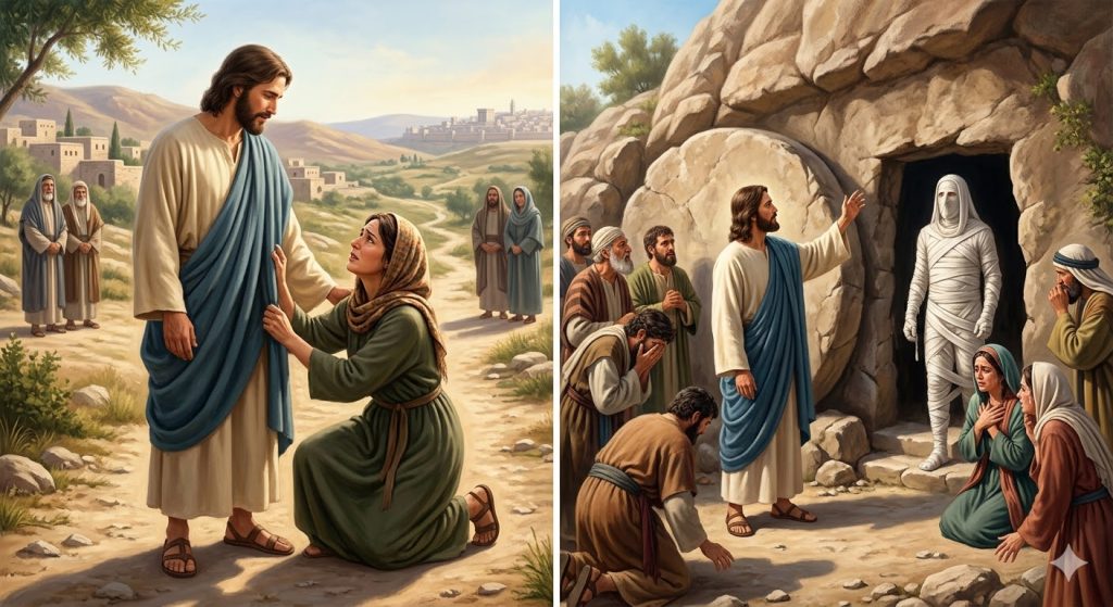 Maria zaczęła swą rozmowę z Jezusem tymi samymi słowami co Marta. Upadła Mu do kolan w geście modlitwy. W tym momencie przypomniała tę chwilę w ich domu, kiedy Pan pochwalił jej zasłuchanie, nazywając je najlepszą cząstką. Wtedy też klęczała u Jego stóp. Jezus wzruszył się i zapłakał dopiero teraz.